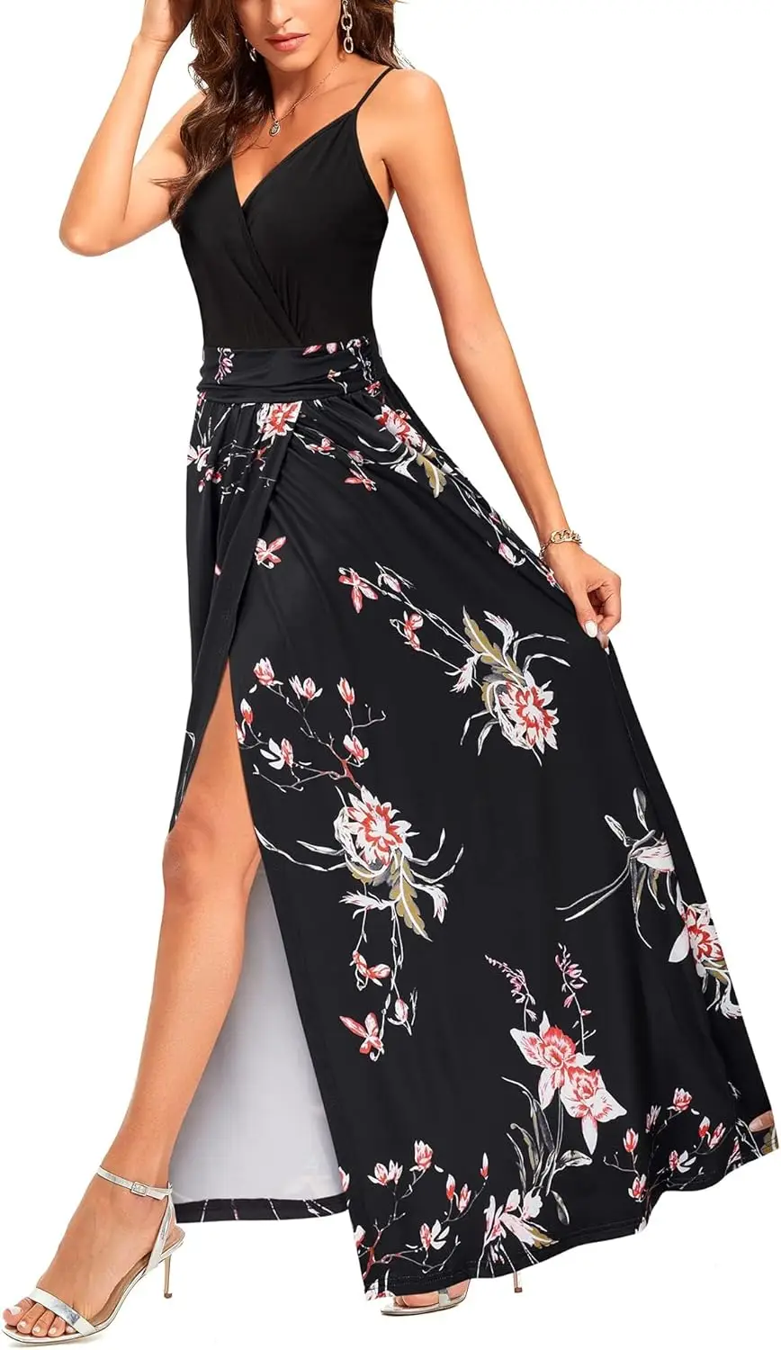 Women's Autumn Summer Floral Maxi Dress off Shoulder Boho Split Beach Sundress Wool Floor-Length Digital Printing Vacation